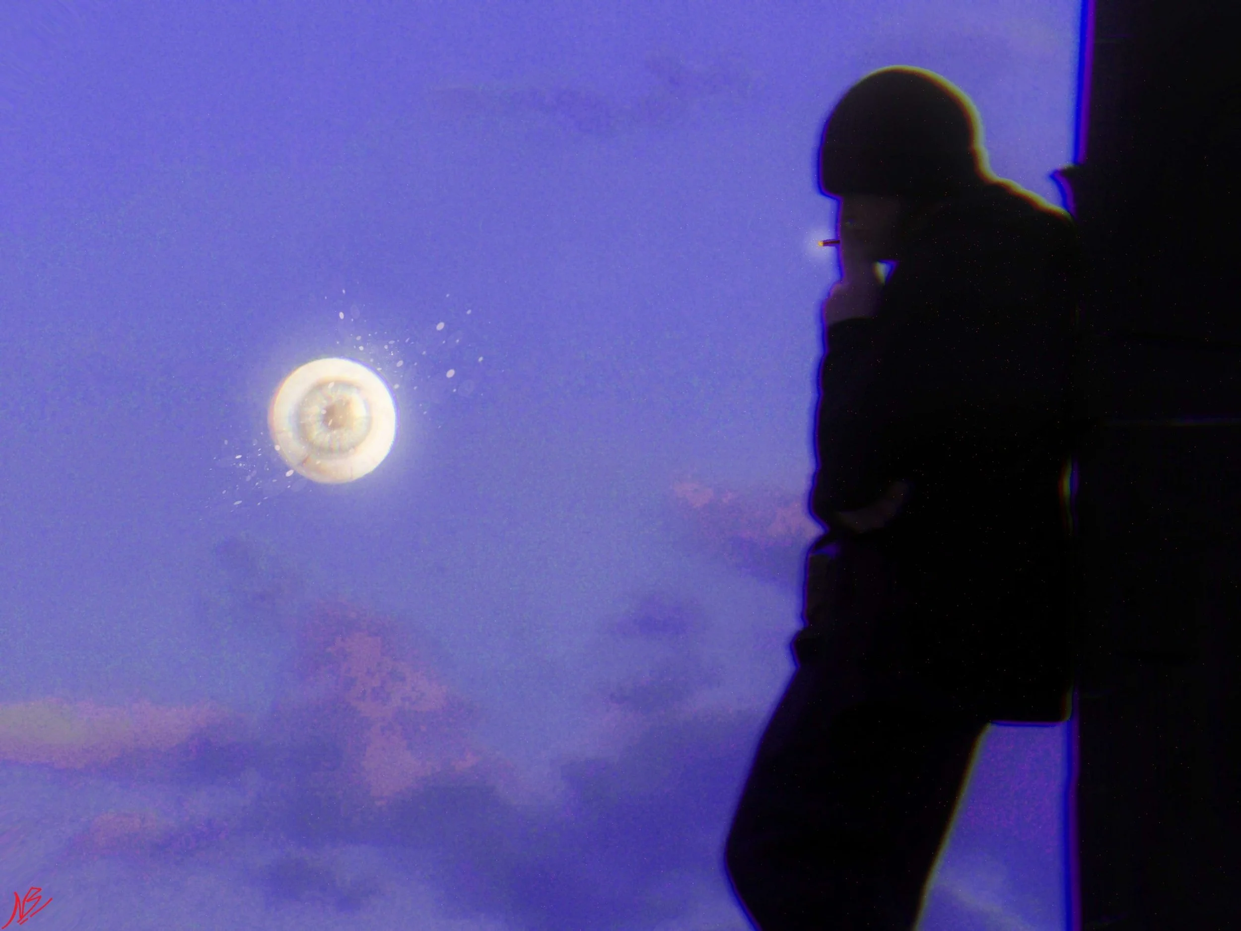 The driving force behind my work is the human condition. For this piece, the purple sky represents dread and exhaustion, a daily struggle. The silhouette shows that we know we exist, but don’t always know who we are. The moon is a looming eye that encapsulates that every move is monitored online by our government, holding us under a watchful eye. Something I have personally always felt.