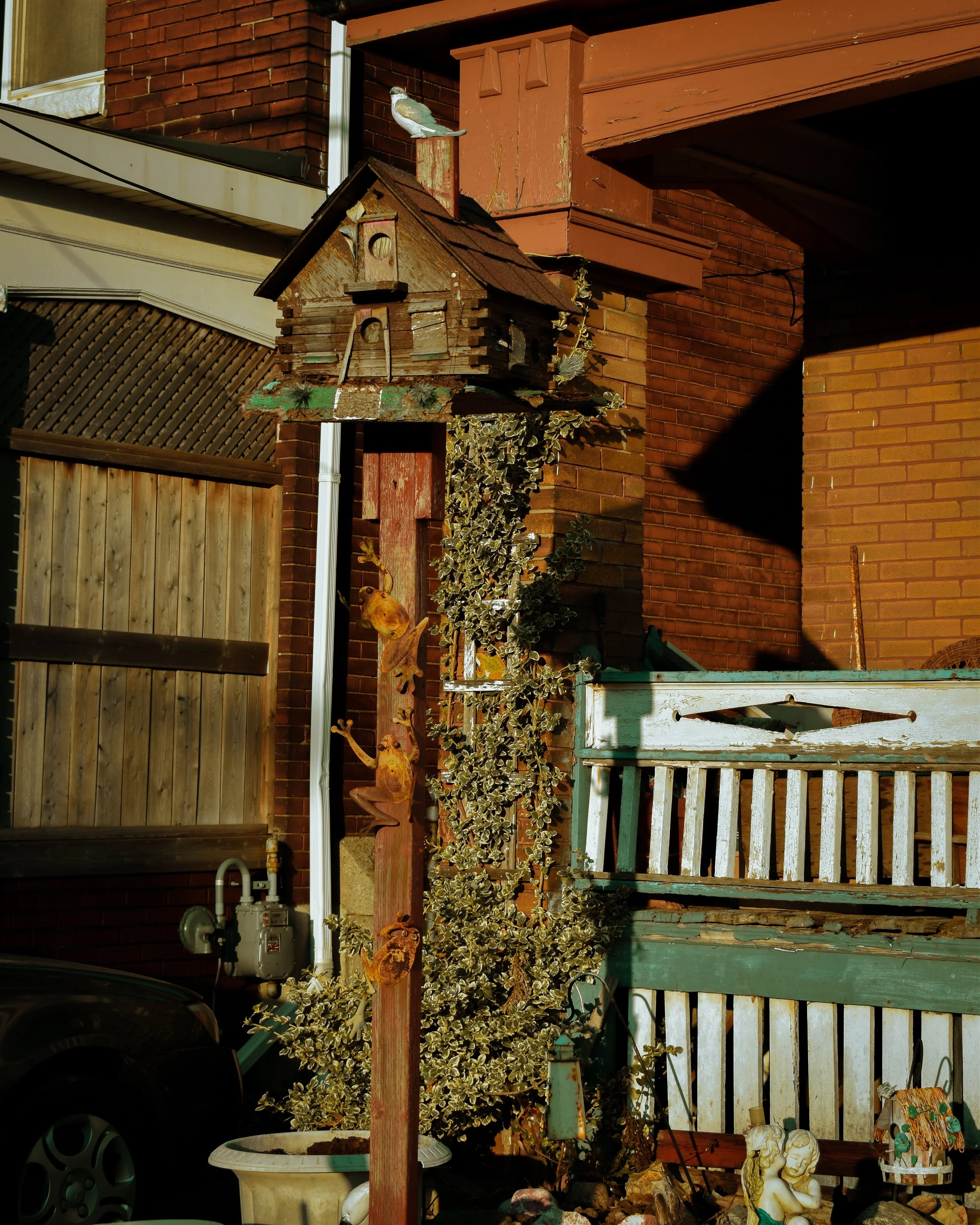 I started my photography journey by taking photos of school games and I developed my skills in taking photos with everything from sports to nature. While taking so many random pictures, this picture stood out to me. This photo was taken early in the morning while I was walking to school for a sports game. The light at sunrise revealed a peaceful scene, a birdhouse with small birds perched around it, surrounded by details of the woods, brick, and vines. Out of all the photos I took of it, this one stood out the most to me because of the detail and balance in such a good background setting, I felt calm and alive at the same time while looking at this photo.