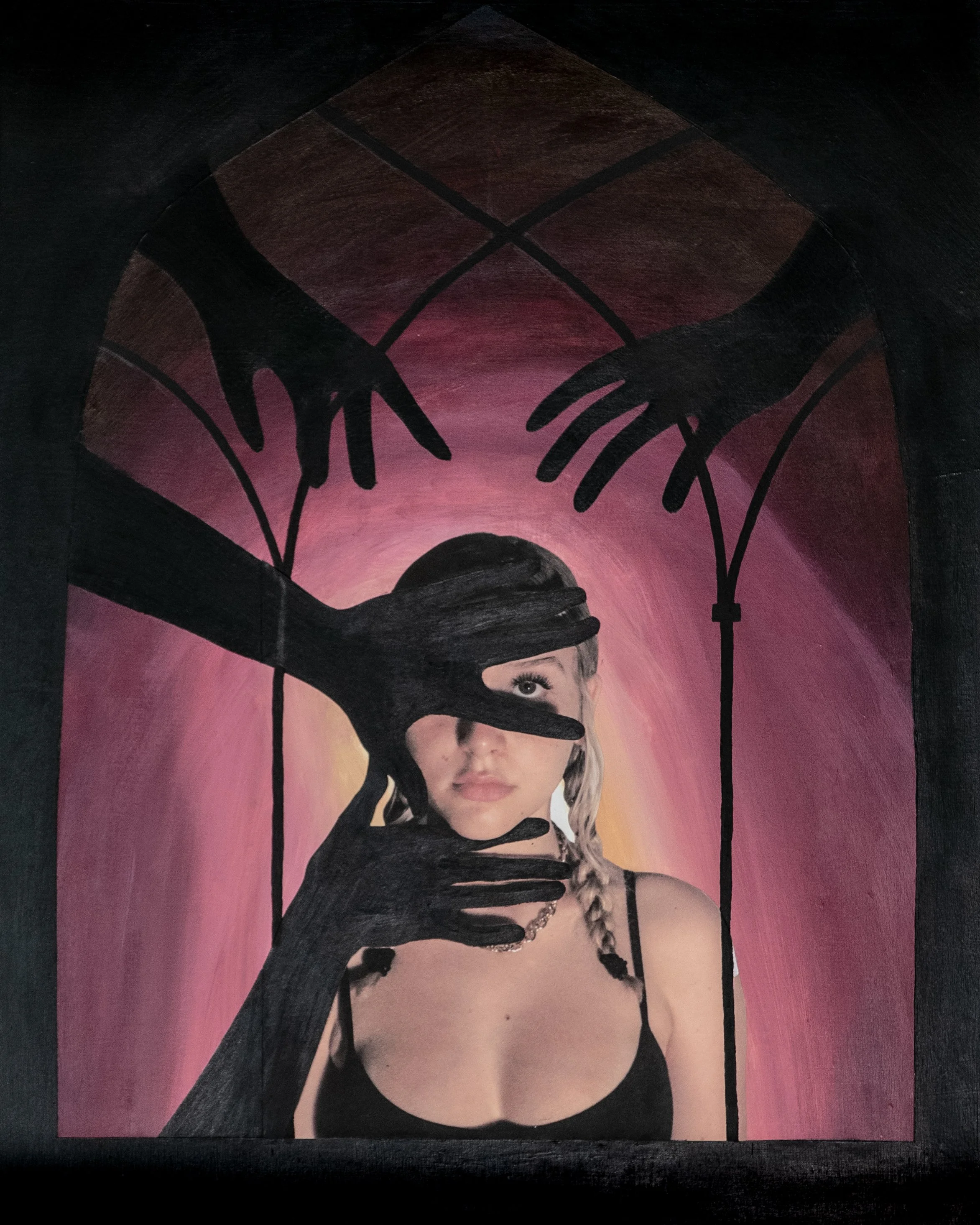 This piece started with the image of a blade cutting from inside. I wanted to explore how external environments shape interior perception and vice versa. For this painting, I used acrylic and a collage of photographs I took of the city. A city is the collective impression of its inhabitants; it is worn and shaped by them as they are worn and shaped by it. My painting is thin and smoky because I wanted there to be an underlying ambiguity and stillness in the image. Intimate yet impersonal, the figure is vulnerable, but their head is severed from the frame, disconnecting us. Injury is where the inside and outside of the body meet. Action on environment is externalized thought; thought is internalized environment.