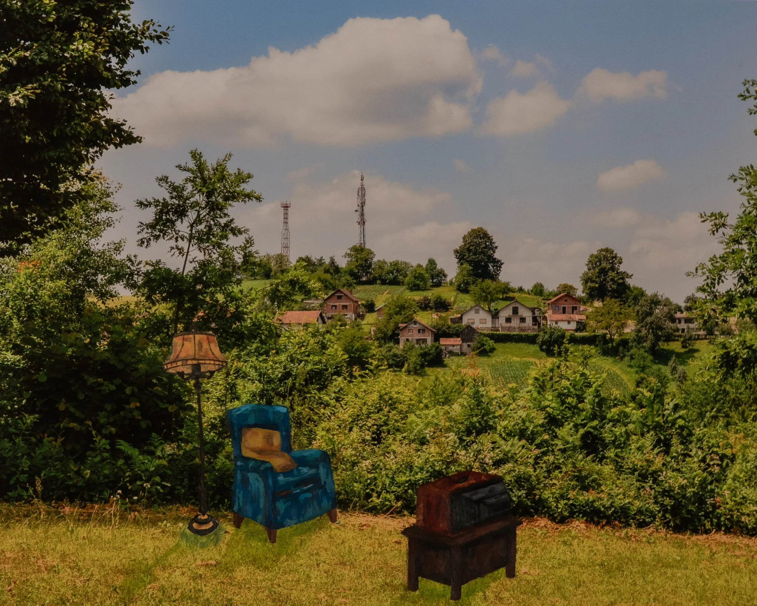 In Nature's Living Room I explore the relationship between natural and human-made environments, challenging viewers to reconsider their relationship with nature and their concept of "home." The piece features a photograph I took of a natural landscape in Bosnia as the background. In the foreground, I painted familiar living room objects integrated into the natural setting. By blending these elements, this artwork invites viewers to question the boundaries we create between our interiors and the natural world, sparking reflection on our place within the environment and the definition of "home." Ultimately, this work serves as an invitation to see the beauty between the wild and the domesticated, encouraging a deeper connection to nature in our daily lives.
