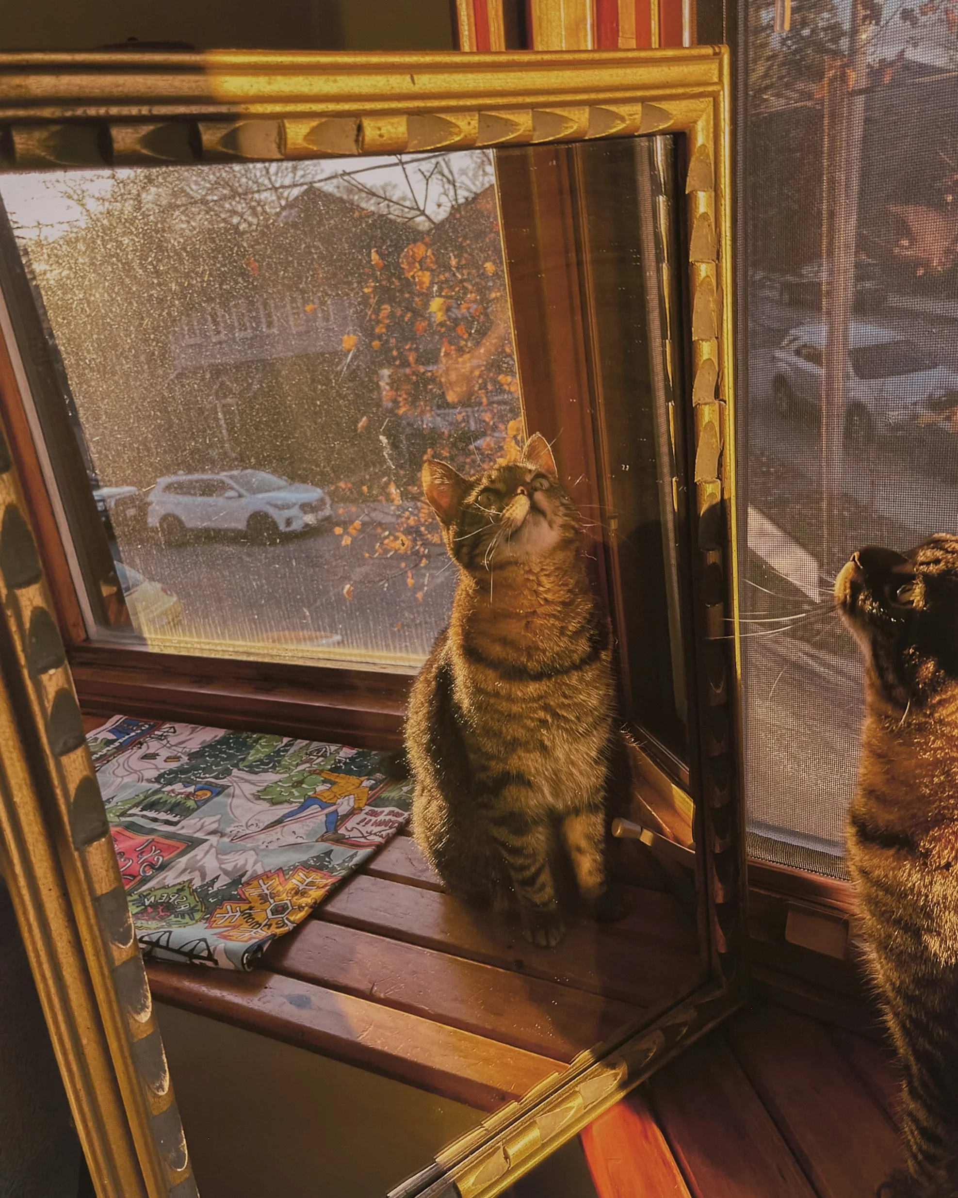 This photo captures a serene moment, the simple joys of life. A tabby cat sitting peacefully on the windowsill in front of a mirror. You might feel curiosity and contentment as the cat soaks up the sunlight. There is a warm glow filtering through the window, which creates a cozy atmosphere. We are invited to pause and appreciate the beauty of the present moment. The contrast of the tranquility within juxtaposed with the bold outside world represented by the parked cars, power lines, and trees makes you reflect on how we often find comfort in our own spaces while still being aware of the life happening beyond our immediate surroundings. It's a reminder to cherish these quiet moments and the connection we have with nature, even from within our homes.