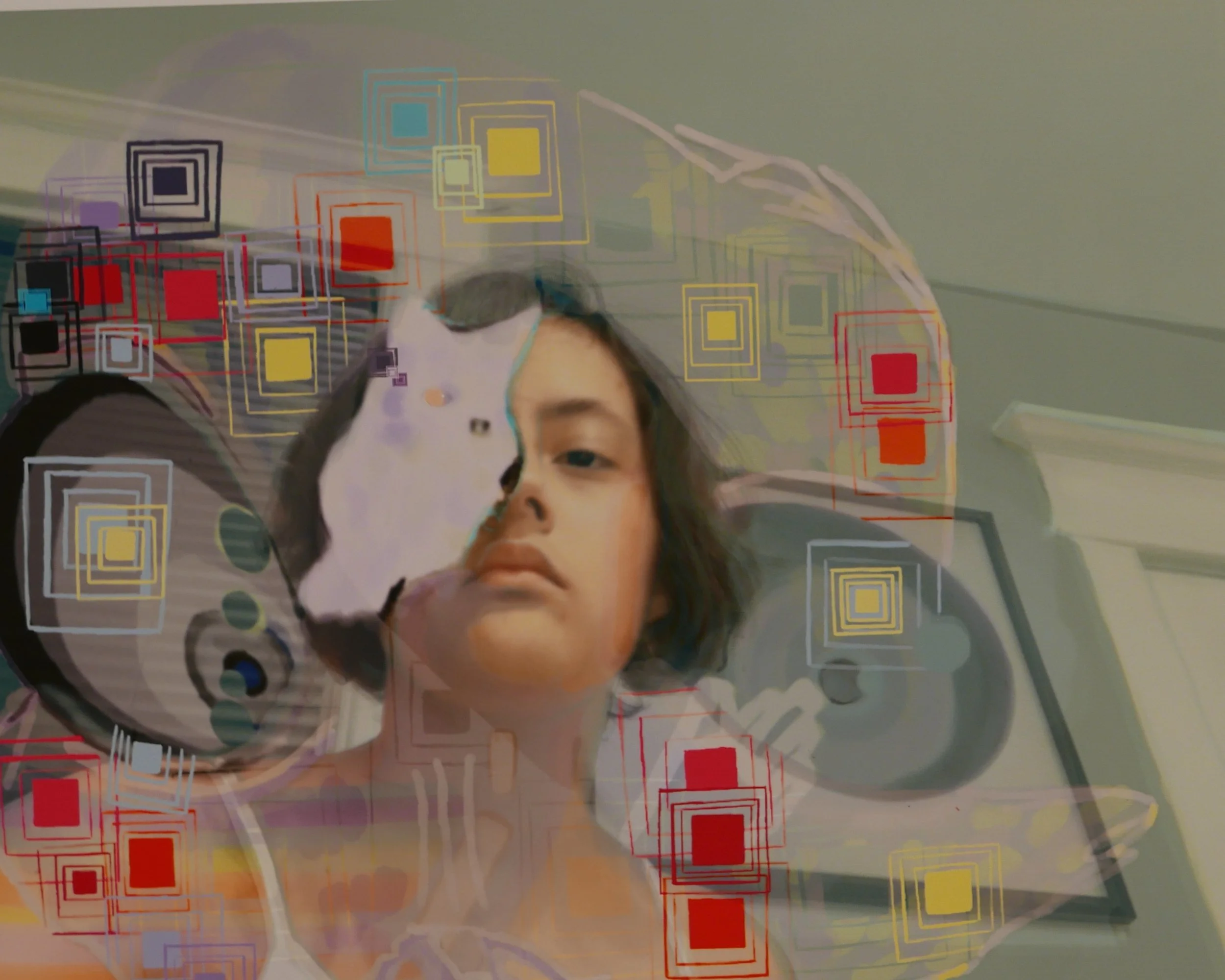 Beyond Bedroom is a piece inspired by the colourful nature of my bedroom—a place of inspiration and creativity, but also one of productivity, relaxation, and independence. I created a piece made of watercolour on a wooden board and hot glue on tulle fabric. The floral border, flourishing and blossoming, represents the “outside” element of my project. Photographic transparencies of myself and the inside of my room in bird's-eye view allowed me to play around with composition. Overall, the piece embodies my love for my bedroom, explores materiality, and shares my story of growth with others.