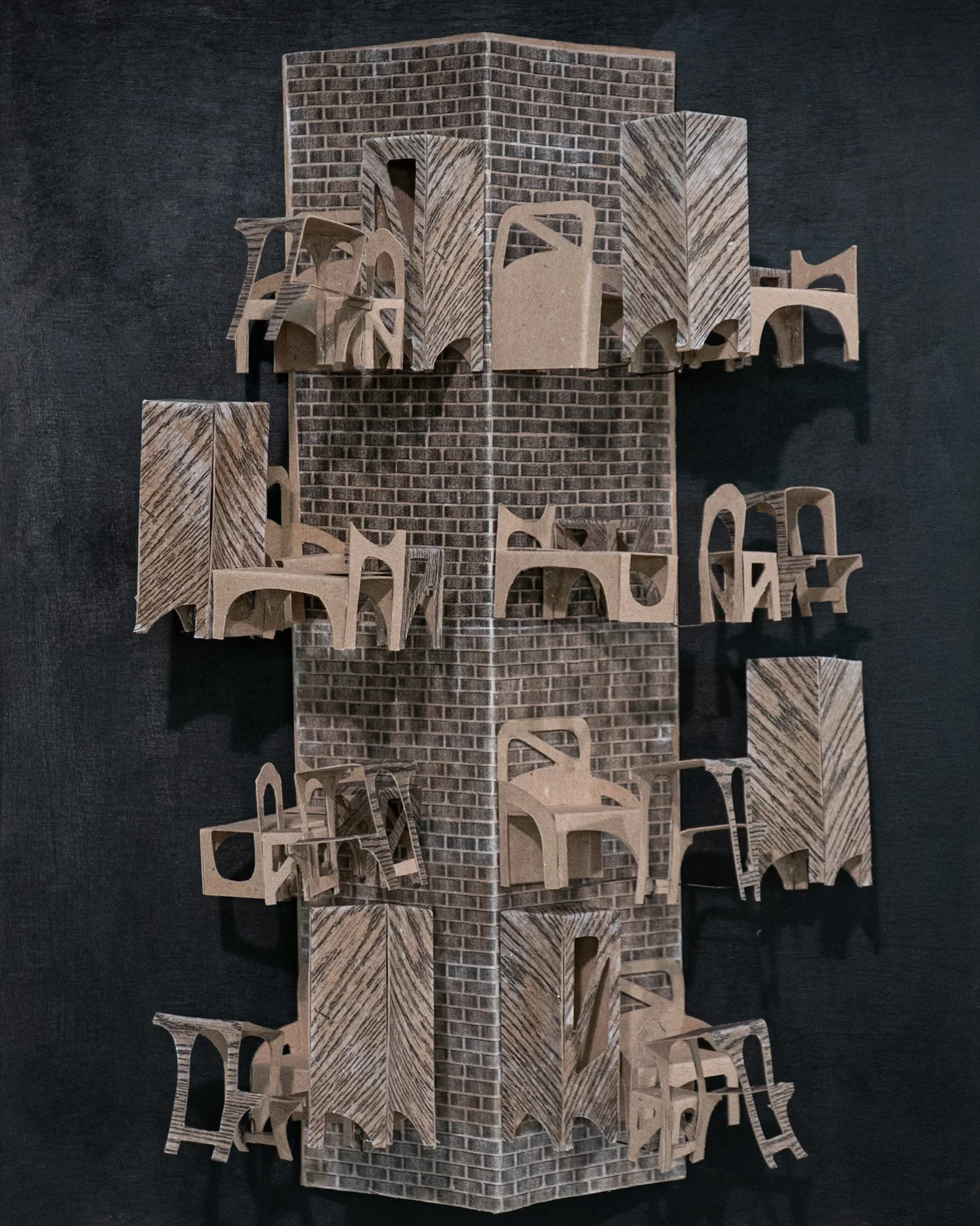 One of the most disappointing things about architecture is that it’s impossible to appreciate both the exterior and interior simultaneously. This was especially felt in the Art Nouveau movement, where the goal was to unite all forms and aspects of art. In my piece I worked to resolve this by bringing the inside outside, creating a surrealist building out of cardboard that united the mediums of 3D art and photography.