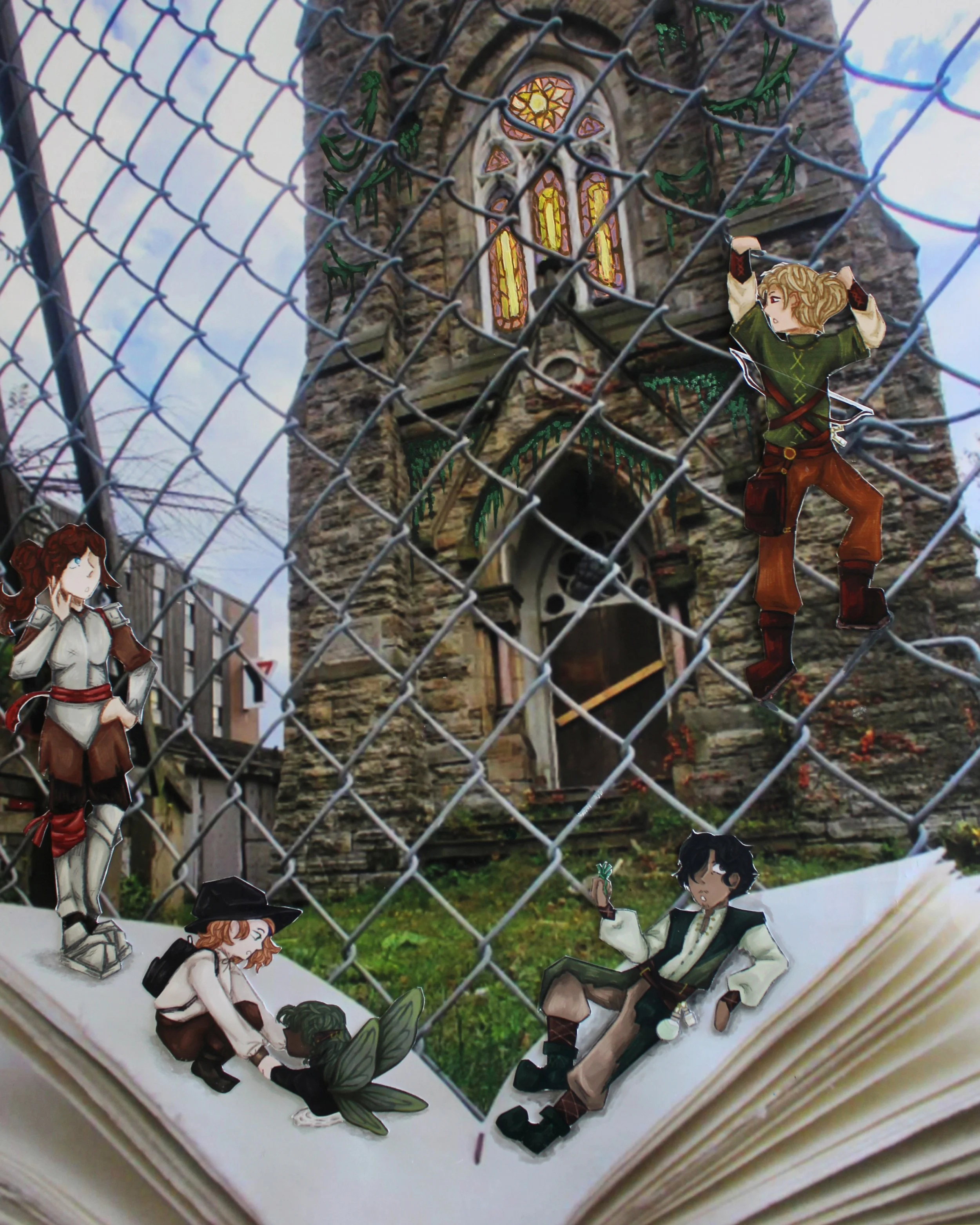 This artwork explores a combination of fantasy and reality. We use books to escape the real world, and what we imagine can come to life in the outside world. Imagination is a powerful thing, and being able to bring your ideas to life is truly something special. Art has always been a way for me to explore and express myself as a person. I typically draw for fun and get inspired by the things around me. For this mixed media work, I took inspiration from many fantasy novels as well as Dungeons and Dragons. Each character incorporated has a different role or characteristic. They were drawn digitally so I could manipulate the proportions and details.