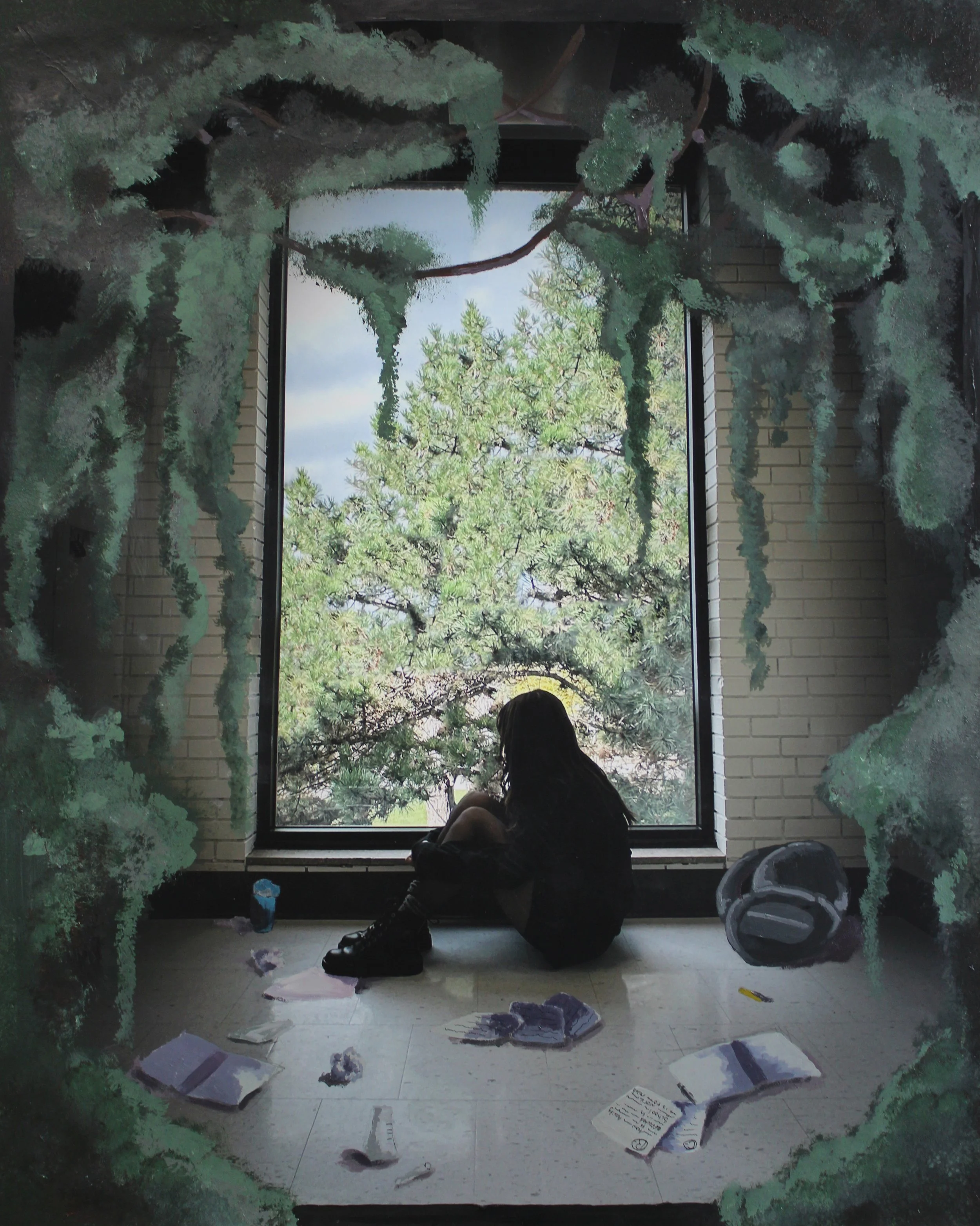 My art is about communicating a hidden meaning. Expressing my own, or others' thoughts in my work to show awareness and understanding of current problems. This work reveals the stress of school, and how school is affecting students' ability to stop and take a look outside. The anxiety and the fear of failure create a constant feeling of confinement, which is revealed in my work through the frame of nature painted along the composition’s edges. Painted representations of school supplies are scattered around the floor to show how much work always surrounds us and how overwhelming it all can be. The person’s identity is concealed in the photograph, so the figure can represent anyone who feels the same way.