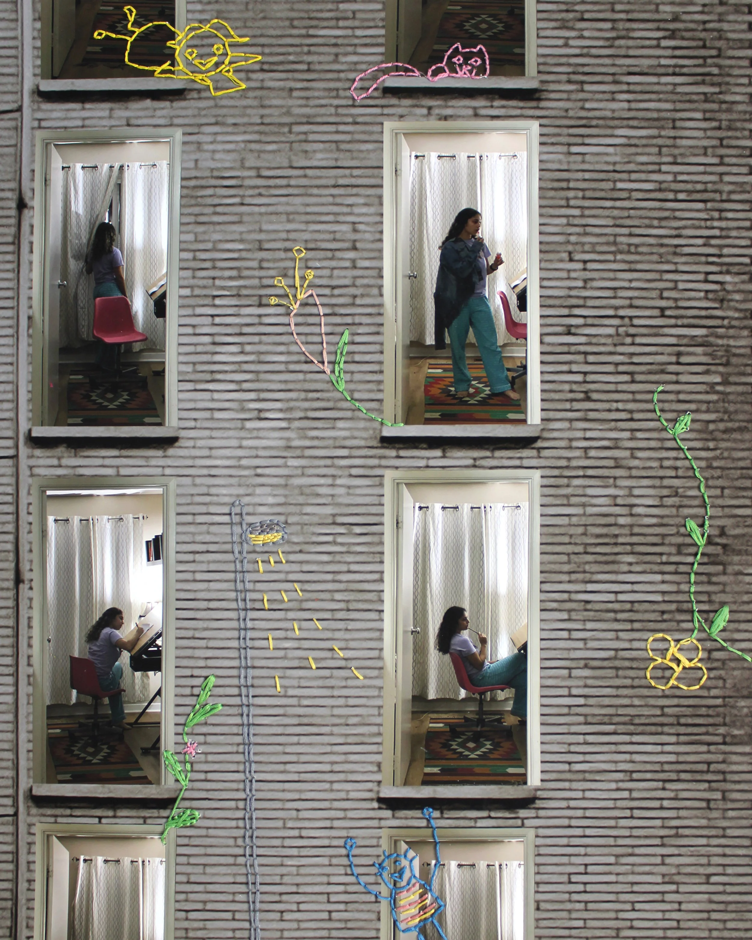 This piece, titled Room by Room, highlights the contrast between youthful imagination and the monotony of urban living while the warmth of personal moments unfold without notice. The theme Inside/Outside is highlighted through the windows becoming doors, revealing an inner moment, and inviting others to reflect on the uniqueness behind every door. Within those spaces, a woman goes about her day, ignoring her colourful surroundings while focusing on work. This project captures the vibrancy that hides within the mundane world and how people ignore important aspects of their lives. The embroidery, symbolizing different family members, represents the inner child’s imagination spilling over the page.
