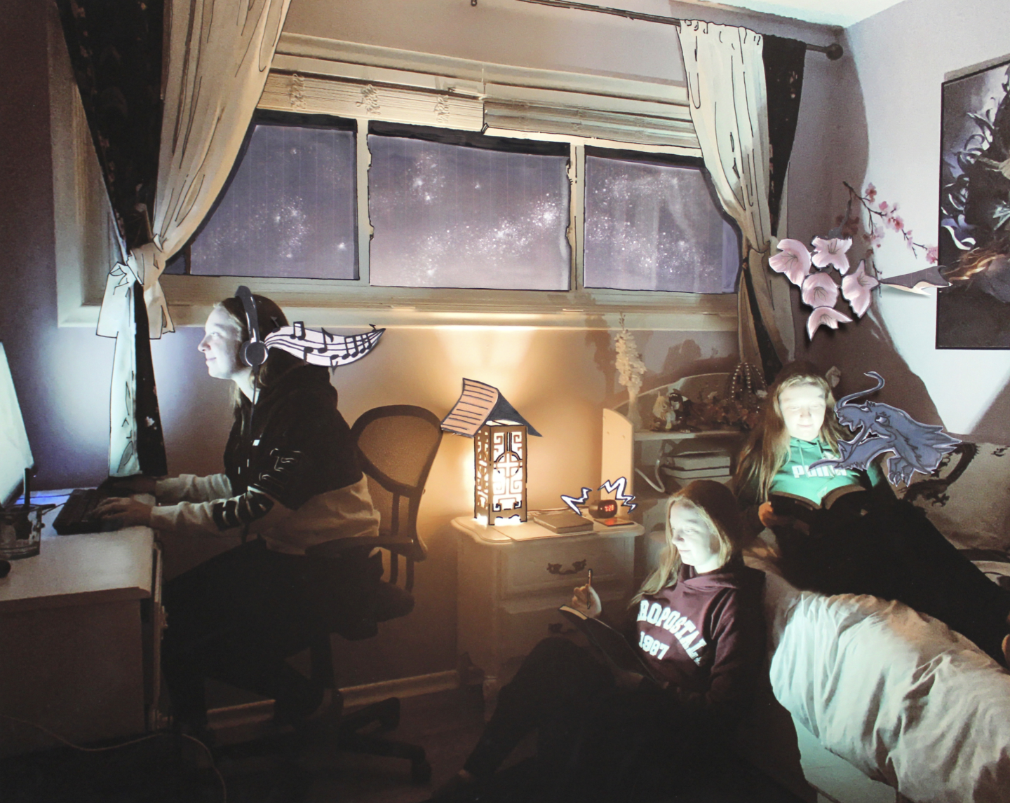 Unbound Imagination was inspired by my inner creativity and explores my love of stories and art. This multiple-exposure self-portrait, created using Photoshop, reveals me engaged in a variety of storytelling activities simultaneously. Much like Eleanor Lindsay-Fynn, who combined realistic and cartoon art, I hope to blur the line between reality and fiction. My piece explores the stories that exist inside the creative heart, wishing to escape into the outside world through a variety of art mediums. Whether inside or outside, reality or fiction, there exist aspects of art and story in even the most mundane bedroom objects. The world is full of stories and art, if only you are willing to look for them.