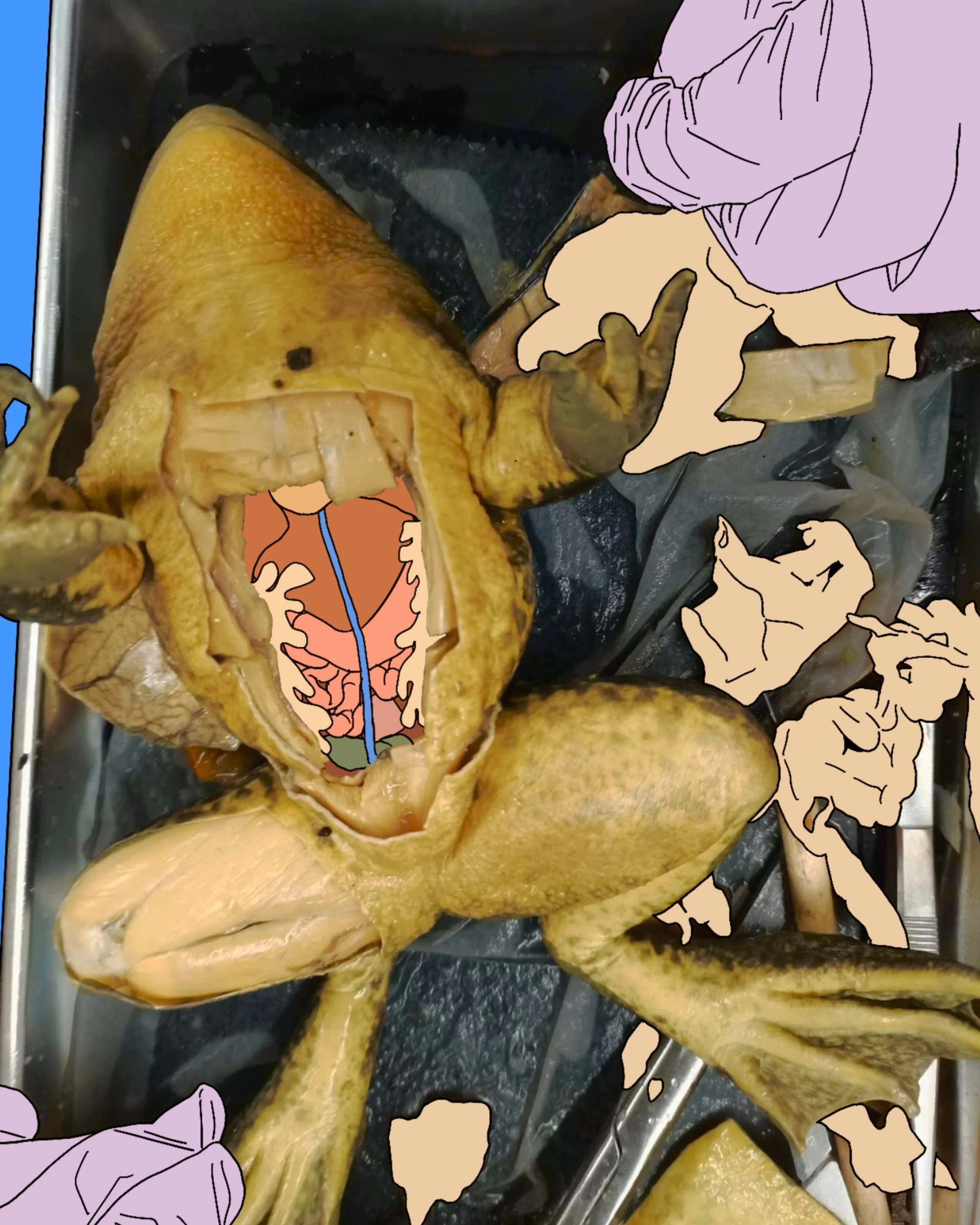 As an art student specializing in drawing and painting, I have created a mixed-media piece combining a real photo of a dissected frog with illustrated internal organs. When thinking about the theme, Inside/Outside, I realized that comparing a frog's body to a building structure reveals intriguing parallels.