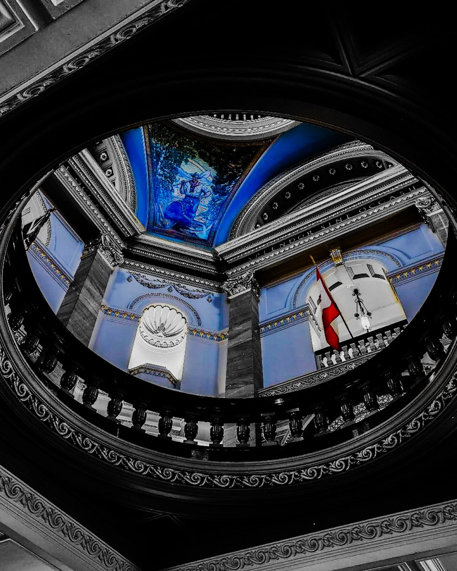 This picture was taken while I was looking up inside the Legislative Assembly of British Columbia in Victoria. To draw attention to the red Canadian flag and the deep blue ceiling, I used selective colour to enhance the saturation. To help pull the eye forward, the remainder is in black and white. The sense of being in a powerful location that links to something greater—such as history, identity, and nation—was something I wanted to explore. The beautiful ceiling reflects the beauty and significance found within, while the flag symbolizes what is outside. The boundary between within and outside, both in locations and in ourselves, is a common theme in my work. I want viewers to be surprised by what they see and how it relates to them.