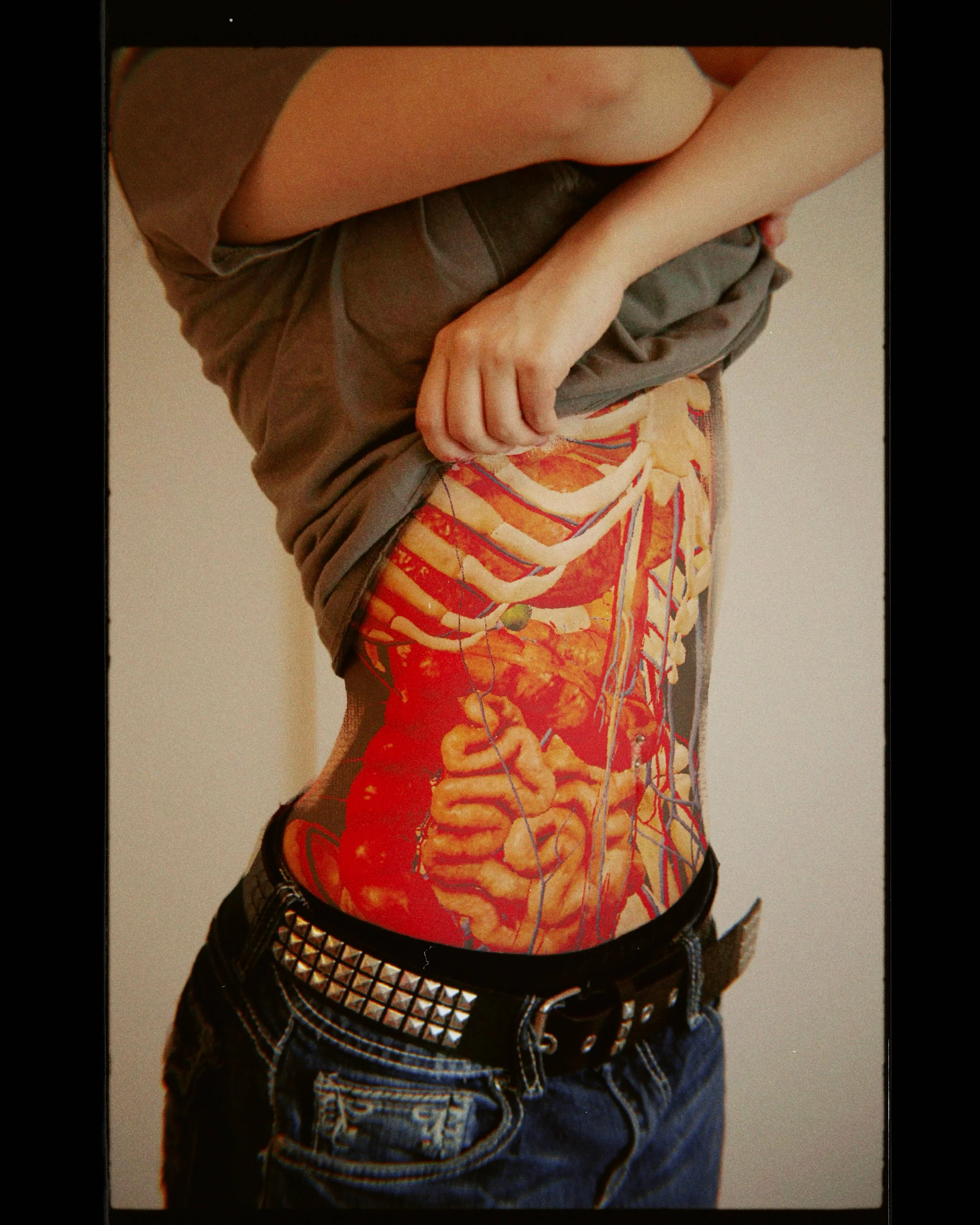 I’ve always liked the human anatomy pages in my biology textbook. They often feel unspeakably bizarre when I suddenly turn to them. It feels like the body is speaking to itself. So I combined human anatomy onto myself to create this creepy but in some way beautiful image.This makes me feel that humans are delicate machines and that what defines us is just the pile of flesh beneath our skin. Connecting human minds with the body—and always seeking for self-understanding—means a lot to me.