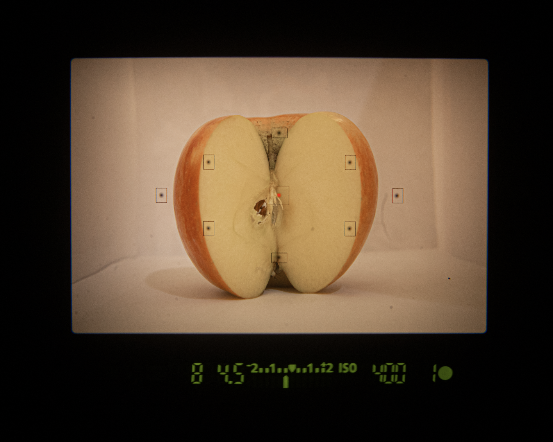 The inside view of a camera shows the outside world. The first camera is pointed towards a cut-open apple, which creates a layered inside-outside theme. An interesting and subtle lighting effect takes place around the border of the frame of the first camera.