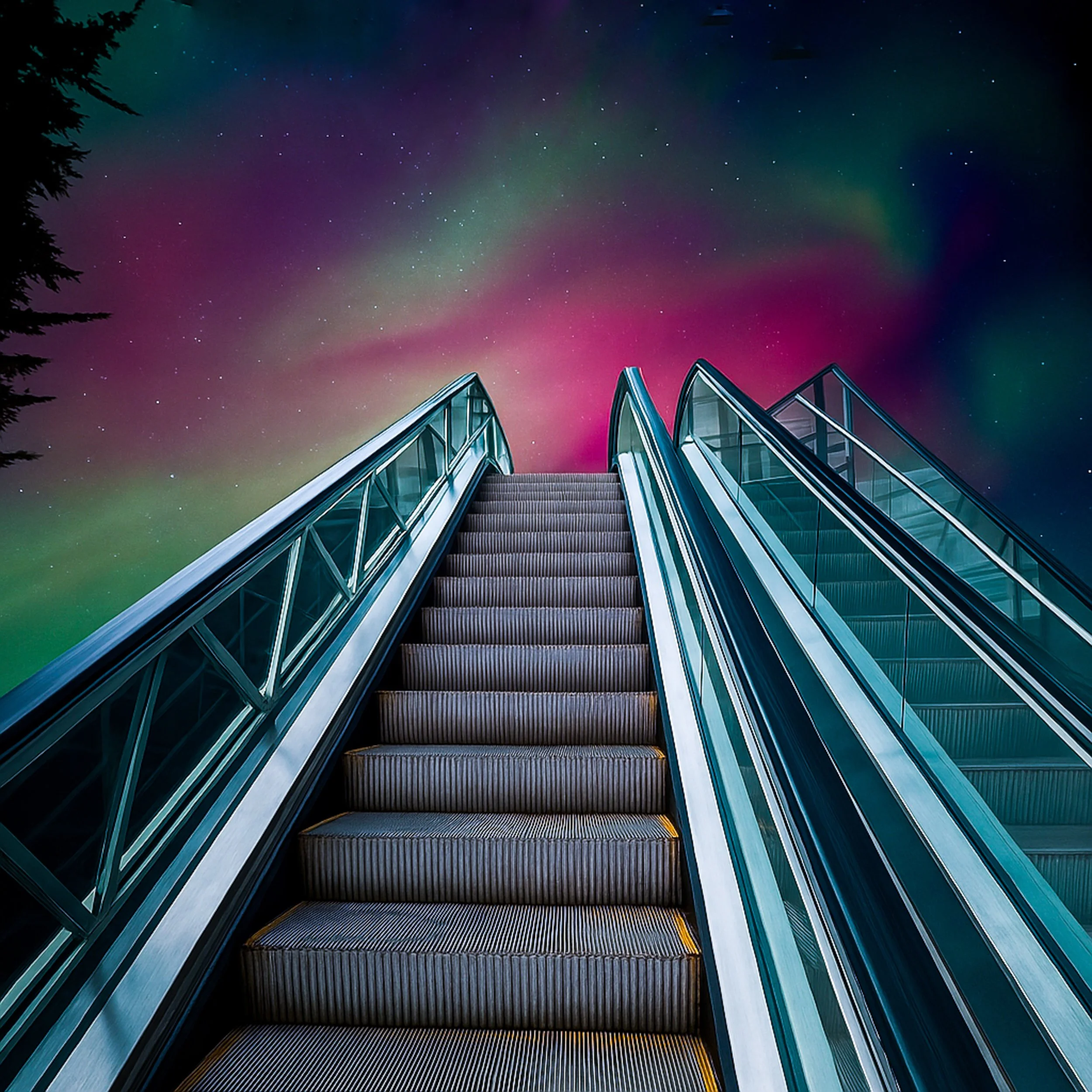 This image explores the tension between the inside—human society—and the outside—the vast, expressive unknown. The escalator represents progress, repetition, and constructed order, rising like a loop we can’t escape, echoing systems and patterns that define modern life. Are we still anchored to Earth or have we already crossed into the sky? The ambiguity challenges our sense of scale and direction. The northern lights suggest the outside—nature, freedom, and imagination. The juxtaposition asks us to consider where we truly are. Within the limits of human-made structures, or on the edge of something greater? It holds us in a moment between the constructed interior of civilization and the boundless, luminous exterior of the unknown.