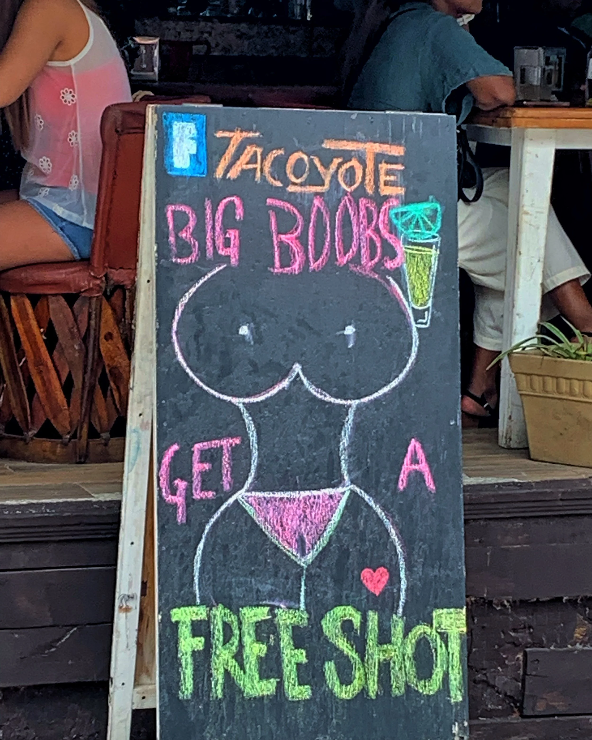 I lived near the beach, where many tourists and common villagers live. We used to go around the tourist street sometimes to walk. During this spring break, I happened to find a sign from a bar advertising in a teasing way towards women that 'big-boobed women get free shots,' which captivated me enough to take a picture of its degrading depiction of women through emphasizing their curvy bodies and, while intentional or not, showing their breasts and visible vaginas through their bikinis, which seems like an invitation to harass tourists within the club sexually. All of us must be able to recognize these horrible behaviours in places we used to grow up.