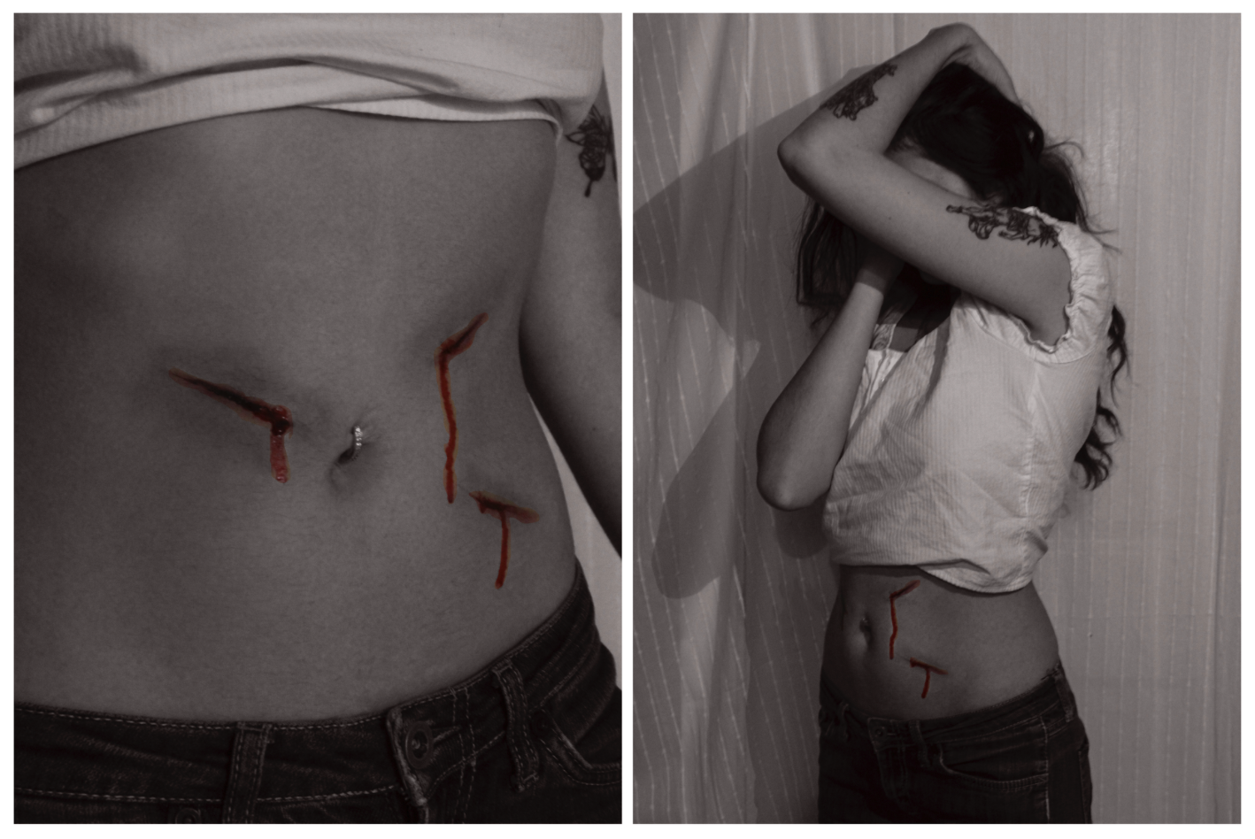 In this photo, I wanted to incorporate the theme of “Inside and Outside.” However, I also wanted to create a powerful message. I thought I should approach the idea literally—bring a girl’s insides out. I thought this would be an effective way to depict the pressure put on young girls to lose weight and to fit into the “beauty standard.” Having the wounds on her stomach in colour was to bring more power to the image and highlight the point I was making. While the rest of the image is black and white, I tinted the image slightly red to make the photo complement the mood. I hope my image can inspire girls to feel comfortable in their bodies.